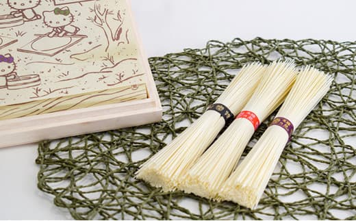 兵庫県たつの市発祥の伝統手延べそうめん「揖保乃糸」が、ハローキティの木箱に入ったギフトにおすすめの商品です。「揖保乃糸」には小麦の質や原材料、めんの細さ、製造時期の違いによってさまざまな等級があり、その中から「上級品」「特級品」「縒(より)つむぎ」の3種類のそうめんを味比べが楽しめるセットになっております。