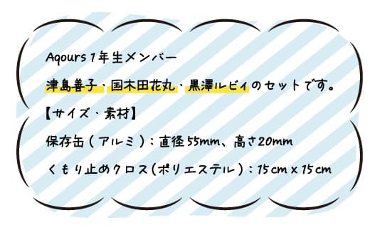 - Aqours1年生メンバー(津島善子、国木田花丸、黒澤ルビィ)デザイン各1個