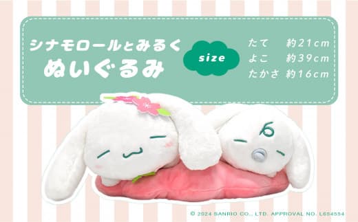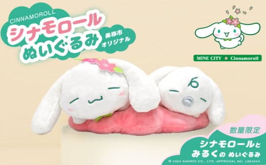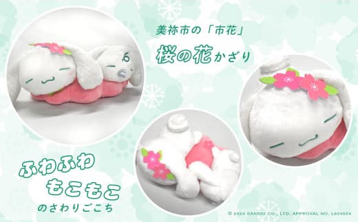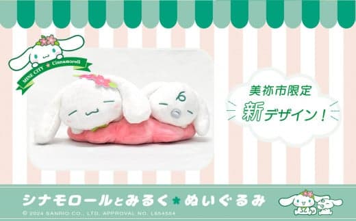 美祢市の花、桜の飾りと桜の葉を首元につけ自然豊かな美祢市をイメージした美祢市オリジナルのかわいいシナモロールにみるくも一緒になった新しいデザインのぬいぐるみです!