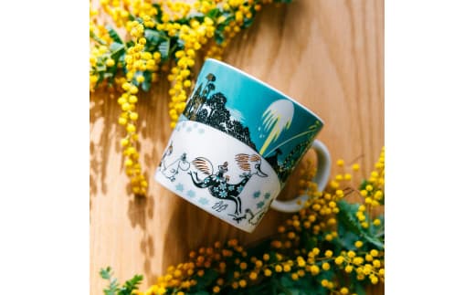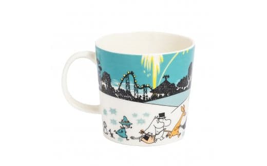 2019年のマグでは夕焼けのムーミンバレーパークをイメージしたような淡い色を背景としていましたが、今回は小説「ムーミンパパの思い出」の中の王様のお誕生日を祝う幻想的な夜のガーデンパーティの様子が描かれました。背景のターコイズブルーがどこか幻想的な雰囲気を醸し出し、ムーミンたちが楽しい一日を終えて素敵な思い出とともに家路につく様子が描かれています。2019年のマグと並べてみると、夕方から夜への時間の移り変わりを楽しく感じさせてくれるデザインです。