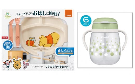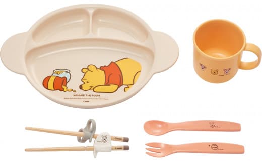 ①くまのプーさんじぶんで食べる食器:くまのプーさんデザインで楽しくお食事を♪ステップアップでおはしに挑戦!入園準備にもおススメの5点セット!