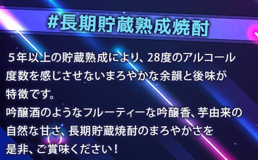 さらに5年以上の貯蔵熟成により、28度のアルコール度数を感じさせないまろやかな余韻と後味が特徴です。