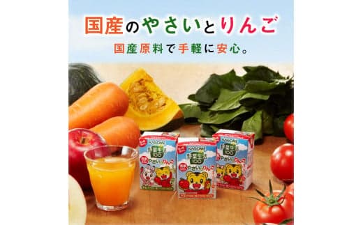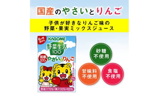 国産の野菜と果実を使用した、子供が好きなりんご味の野菜・果実ミックスジュースです。6ヶ月頃からお飲みいただけます。幼児1食分の野菜70g分を使用し、砂糖・食塩・甘味料不使用。安心して0歳のお子様からでもお飲みいただけます。野菜70%+果汁30%=100%野菜果実ミックスジュースです。子供が大好きなしまじろうパッケージ。飲み切りやすい100mlサイズですので、お弁当に、おやつに、野菜補給にと幅広くご活用いただけます。