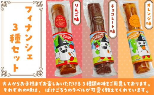 味はリンゴ味、チョコレート味、オレンジ味のフィナンシェが各2本ずつ入っています。