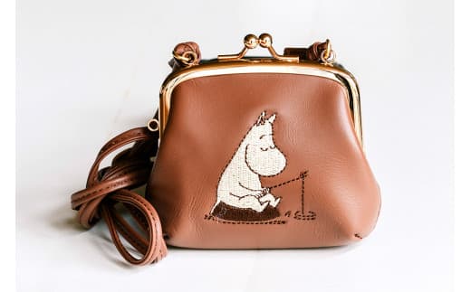素材には軽くて柔らかな国産レザーを使用し、中央に釣りをするムーミンのイラストが刺繍されています。