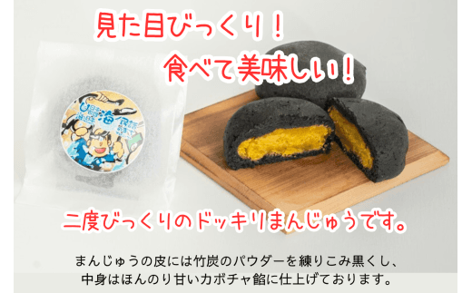 まんじゅうの皮には竹炭のパウダーを練りこみ黒くし、中身はほんのり甘いカボチャ餡にして、