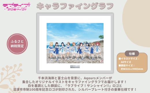 白を基調とした額装に、「ラブライブ!サンシャイン!!」ロゴと沼津市市制100周年記念ロゴが刻印された、シルバープレート付きの豪華仕様です!