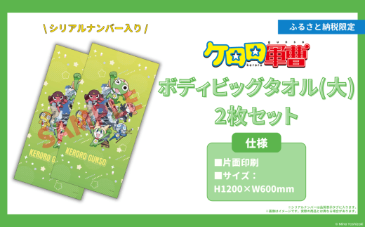 「ケロロ軍曹」とコラボしたアニふるプロデュースのオリジナル返礼品です。【ケロロ軍曹 in 熊本市】 ボディビッグタオル (大) 2枚組 コラボ オリジナル アニメ アニメーション 漫画 マンガ まんが 雑貨 インテリア 日用品 たおる お風呂 風呂 期間限定 常温【2025年1月下旬~2026年10月下旬迄順次発送予定】